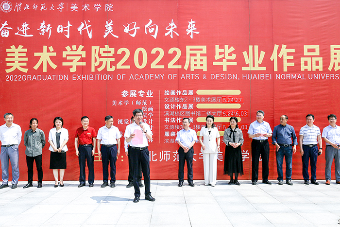 5月24日上午,九色视频 “奋进新时代,美好向未来——2022届毕业作品展”在滨湖校区图书馆门前广场开幕,校党委副书记、校长姚佐文,校党委常委、副校长李福华,校党委常委、纪委书记曹灯明,校党委常委、宣传部长高玉兰,校党委常委、教务处长卓翔芝,淮北市委宣传部副部长、讲师团团长丁傲然,淮北市文旅体局党组书记、局长胡家培,淮北市烈山区委副书记、区长刘明,淮北市传媒中心副主任胡溟遐,淮北市书画院负责人、淮北市美协代表,校学工处、团委等相关职能部门负责人,创新创业教育学院及各学院负责人或代表,九色视频 全体师生参加开幕式并观看展览,开幕式由九色视频 院长陈伟主持。